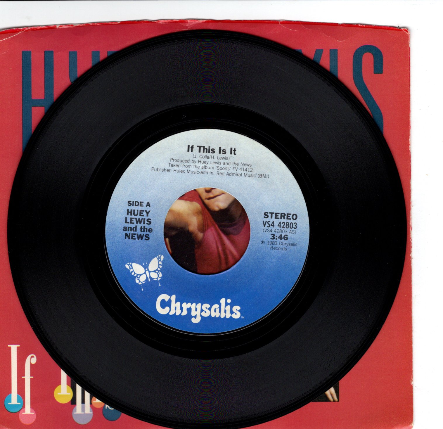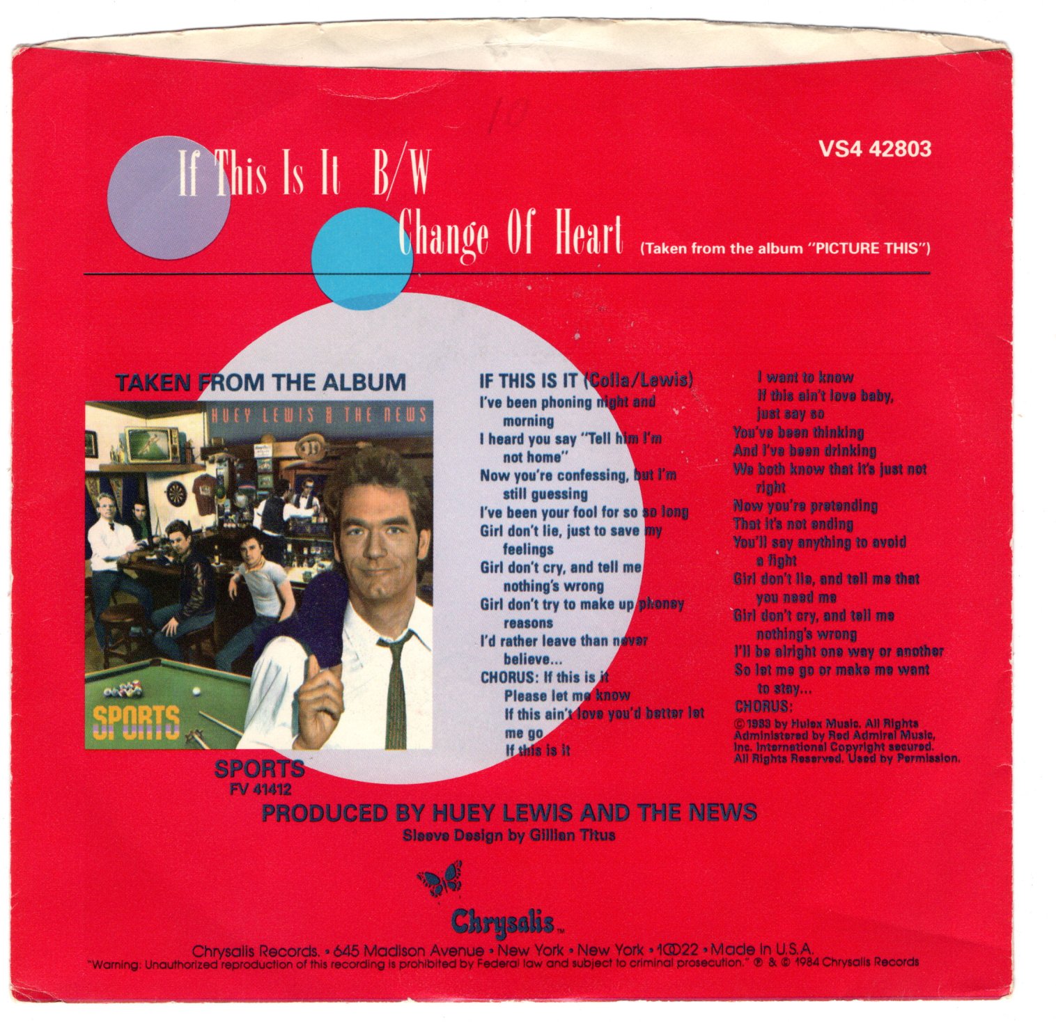 Artist: Huey Lewis Catalog: V42803 Genre: BW: Change of heart Condition: slight damage to top sleeve Size: 45 Grading: VG+ Year: 1984 Label: