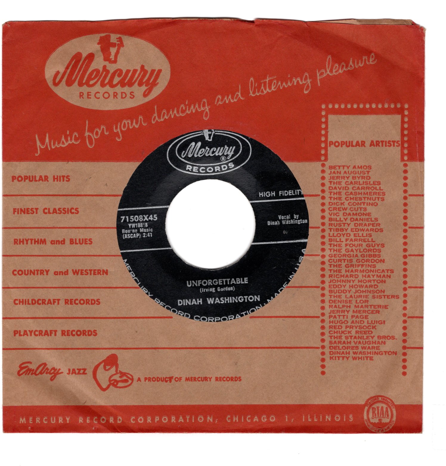 Artist: Dinah Washington Genre: BW: Nothing in the World Condition: Size: 45 Grading: VG+ Year: 1959 Label: